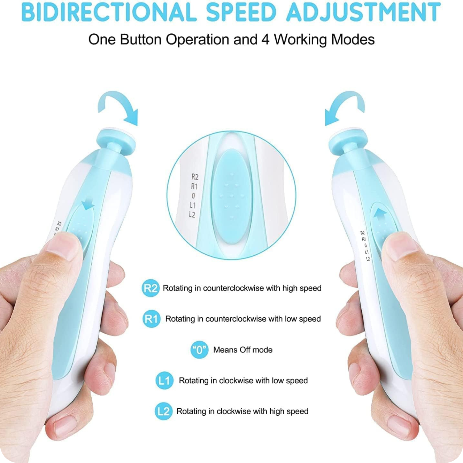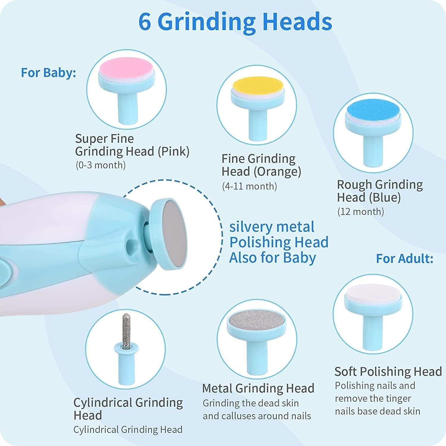 Safe & Gentle Trimming: Specially designed cushioned grinding heads gently file nails without sharp edges, preventing accidental cuts or scratches.